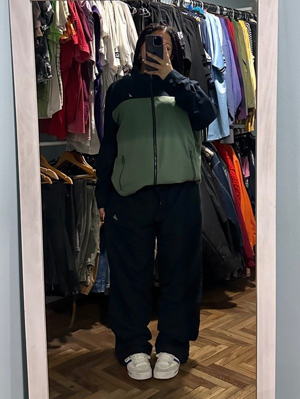 Medidas: 49 cm de cintura 61 cm estirada, 64 cm de cadera, 32 cm de tiro, 112 cm de largo, 26 cm de bota manga.
